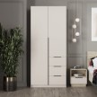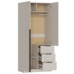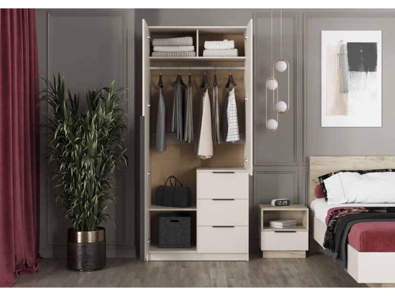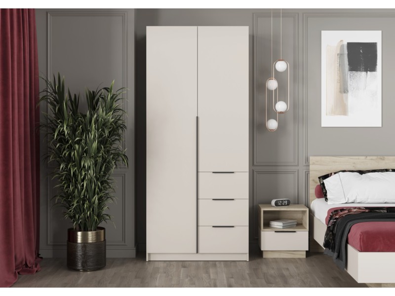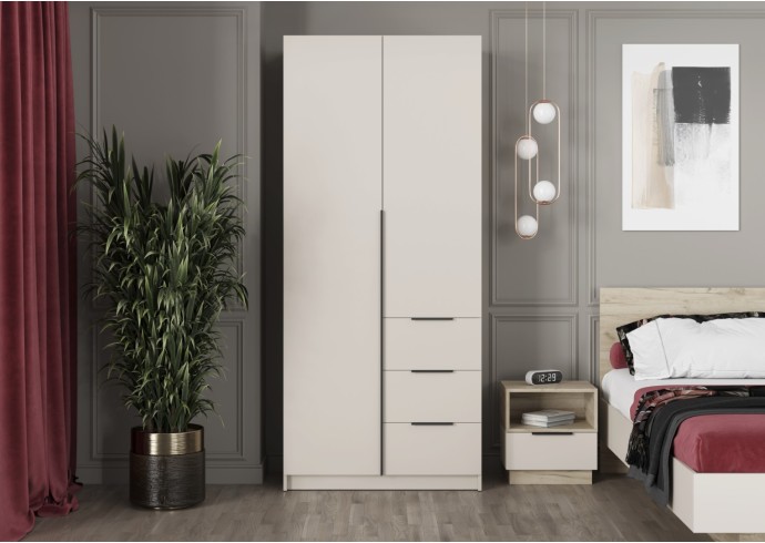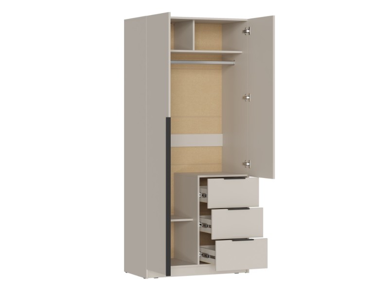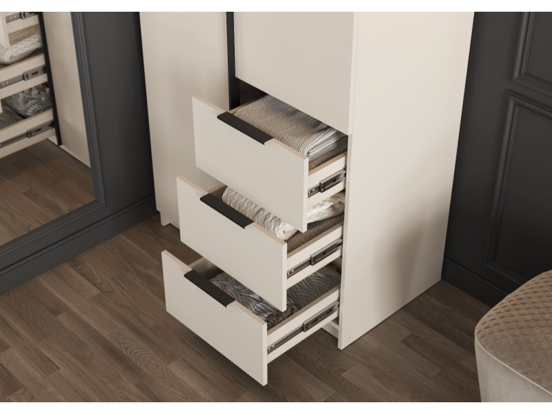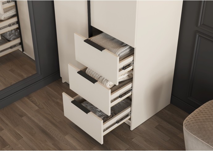 - Элегантный дизайн: Накладные фасады шкафа выполнены в стильном цвете "Кашемир". Левая створка и фасады ящиков оснащены черными пластиковыми ручками, а правая створка - без ручки, что добавляет минималистичный акцент.