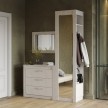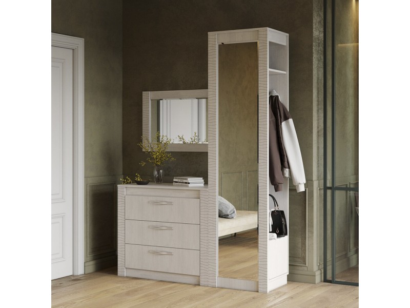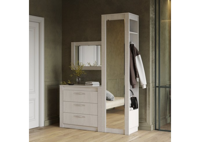 Компактная и практичная вешалка "Монако" – идеальный выбор для небольшой прихожей. Модель состоит из открытой зоны с хромированной штангой и крючками для одежды, а также верхней полки для аксессуаров и нижнего выкатного ящика. Изделие выполнено из ЛДСП высокого качества в цвете ясень белый. Фасад дополнен зеркалом в полный рост и декоративной отделкой из МДФ.